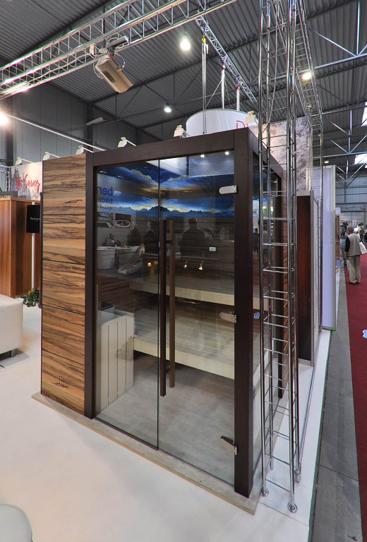 Vybavení je z osiky, ale opěrky jsou vyrobeny z totožného materiálu jako obložení stěn, z Roholu – satin nuss.