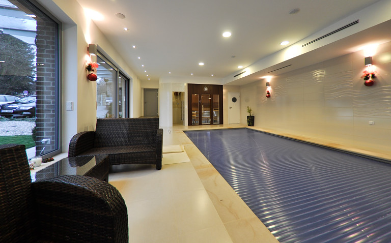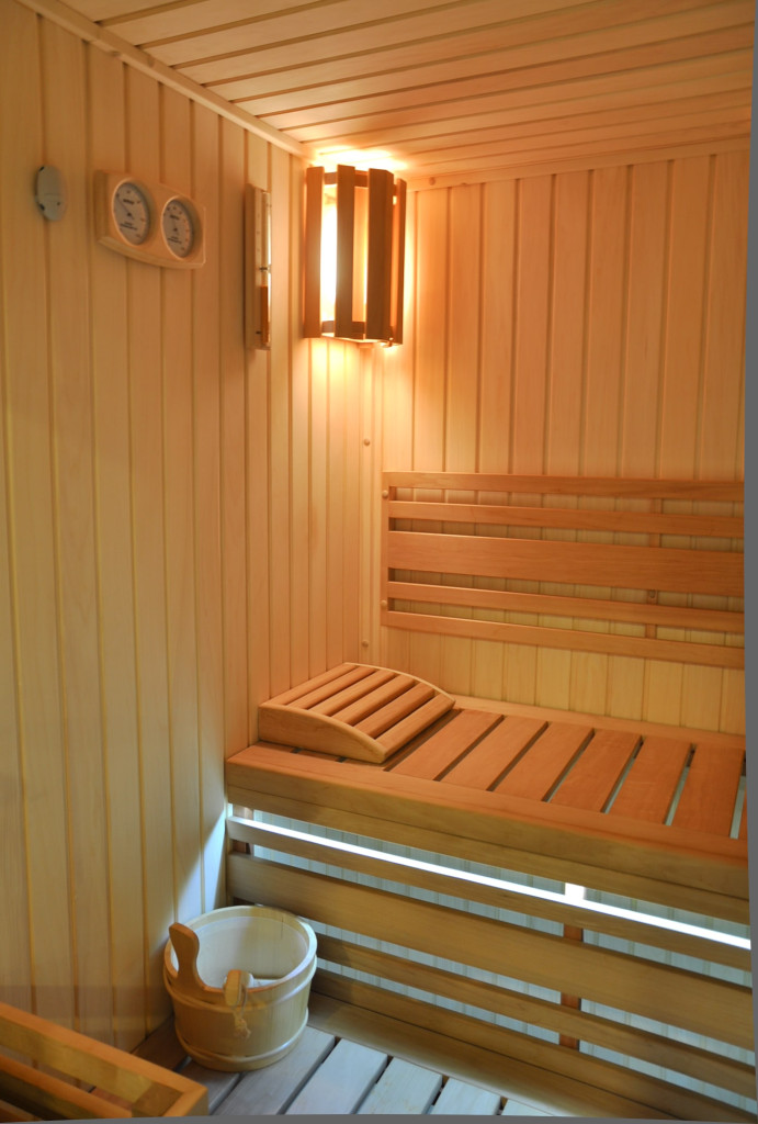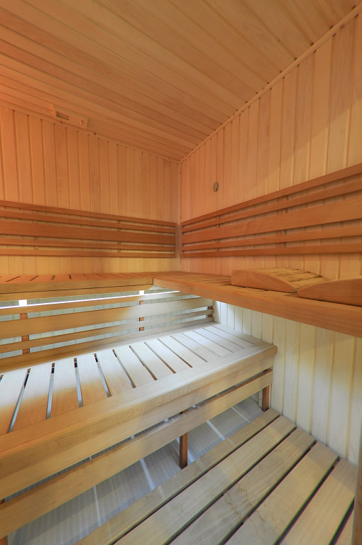 BIO sauna s vnitřním obkladem z osiky a lavicemi z olše. Vnější čelní stěna je vyrobena z tmavého velkoplošného materiálu, aby vytvářela dojem solitéru v jinak světlém interiéru. Lavice v sauně jsou podsvětleny LED diodami umístěnými v hraně lavic.